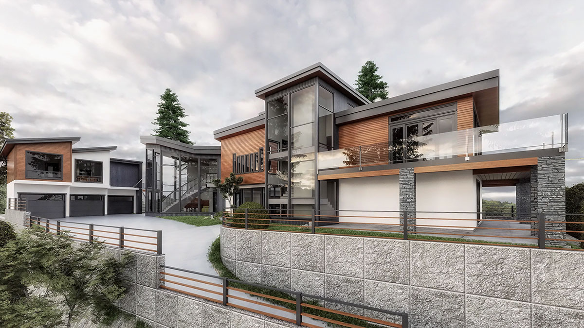 Sleek design and breathtaking ocean views converge to create an unparalleled living experience. Perched elegantly, the house showcases a minimalist exterior, featuring a combination of stone, glass railings, and wood. The architectural design embraces the surrounding landscape, providing a seamless connection between indoor and outdoor living.